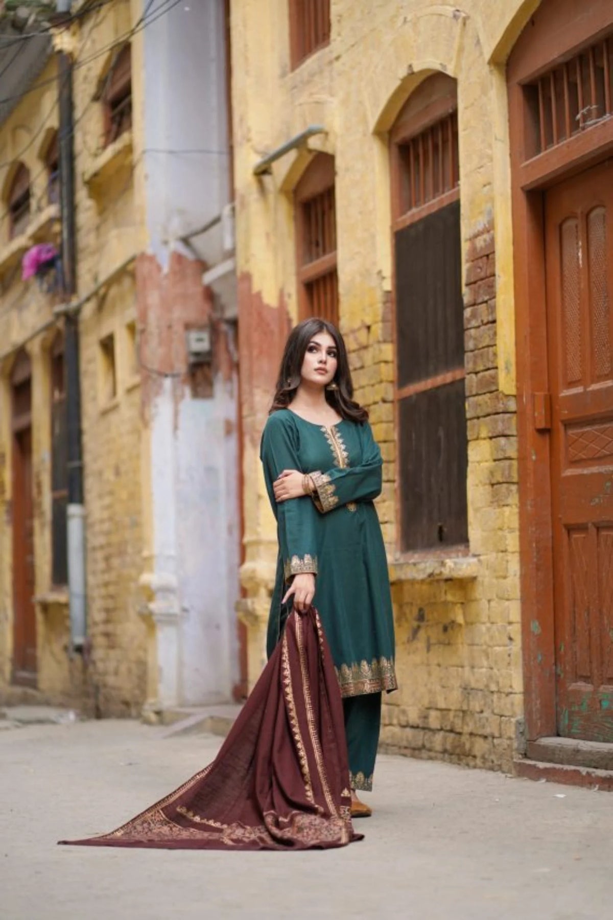 Green Suit with brown shawl - Eleganza