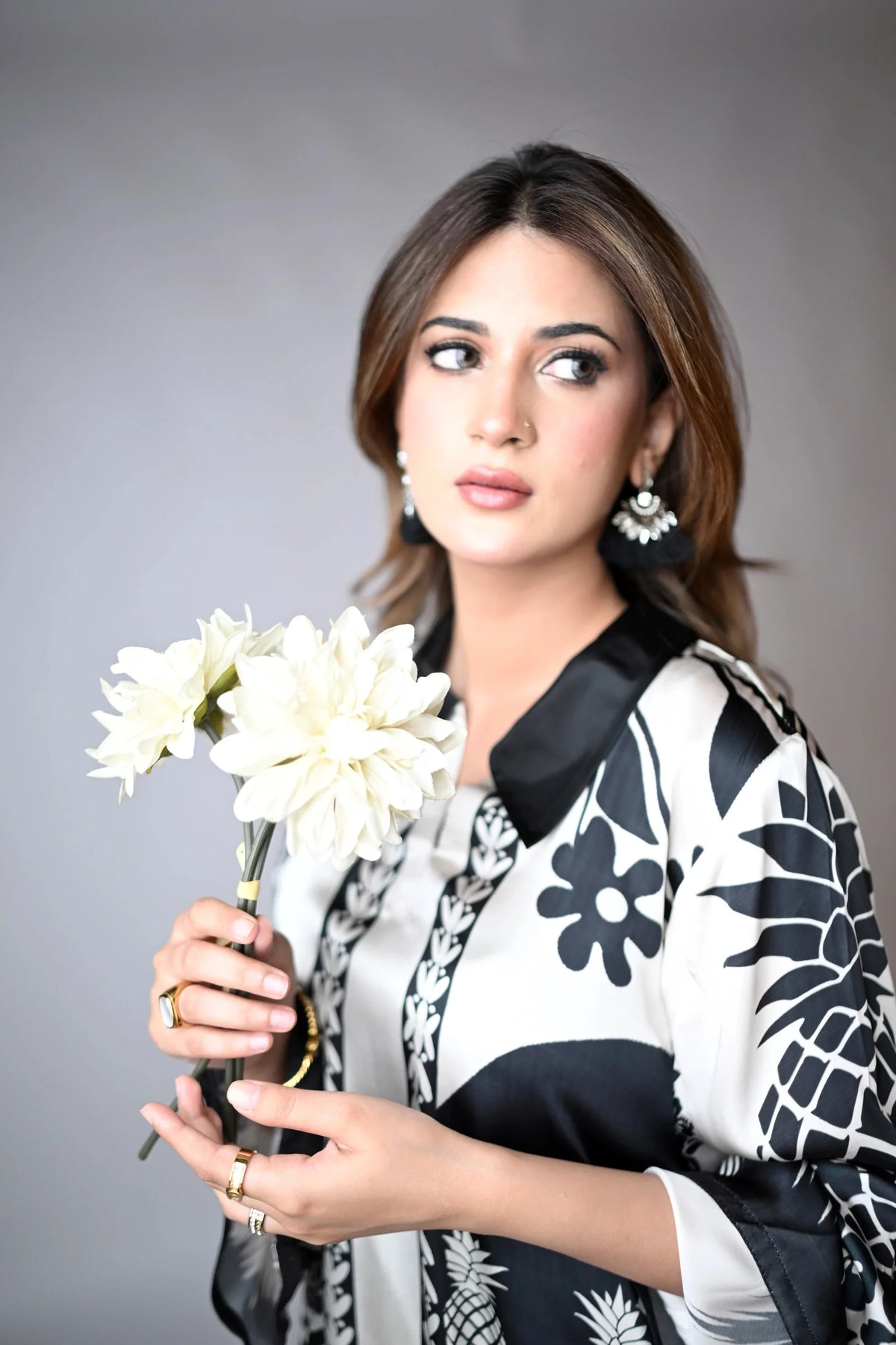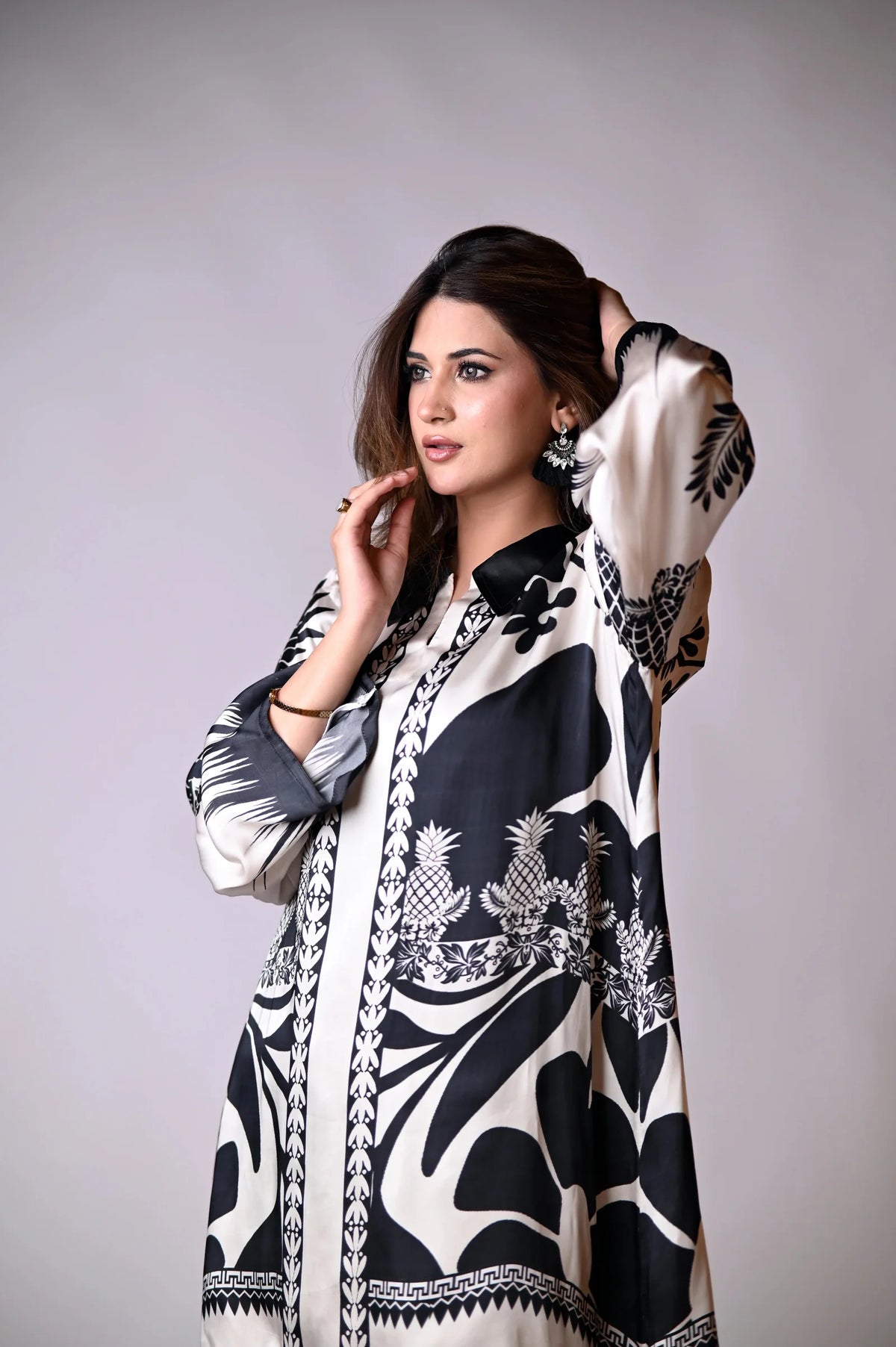 Effortlessly elegant, the Monochrome silk cord set redefines modern chic with a fearless mix of oversized florals and playful pineapple motifs in timeless black and white. This statement piece is designed for the style-savvy woman who loves contrast and character in her wardrobe.