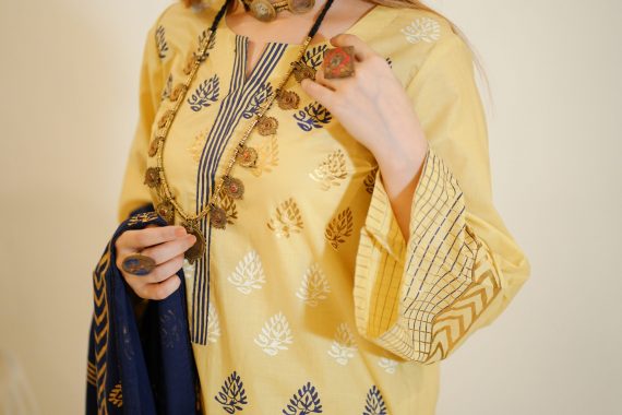 Hand block printed 3pc with block printed heavy work navy blue dupatta. Comes with chora silai Pancha.