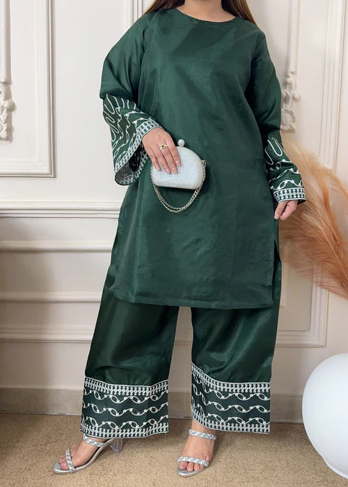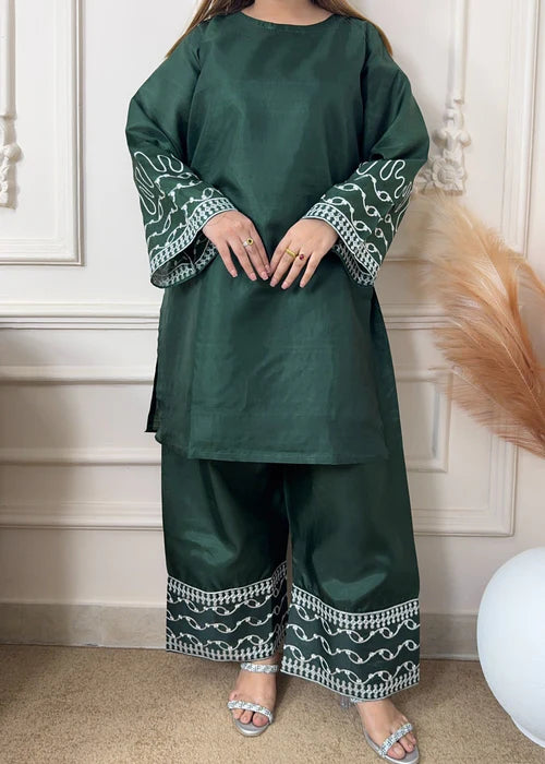 This exquisite Festive/Party Wear Kurta Set is crafted from luxurious Kattan Silk in a rich Dark Green hue. The Short Kurta features intricate embroidery, while the Farshi Shalwar adds a touch of elegance. Perfect for all seasons, this 2-piece set exudes effortless style and sophistication. From Gulle Eida. Fabric is see through use lining