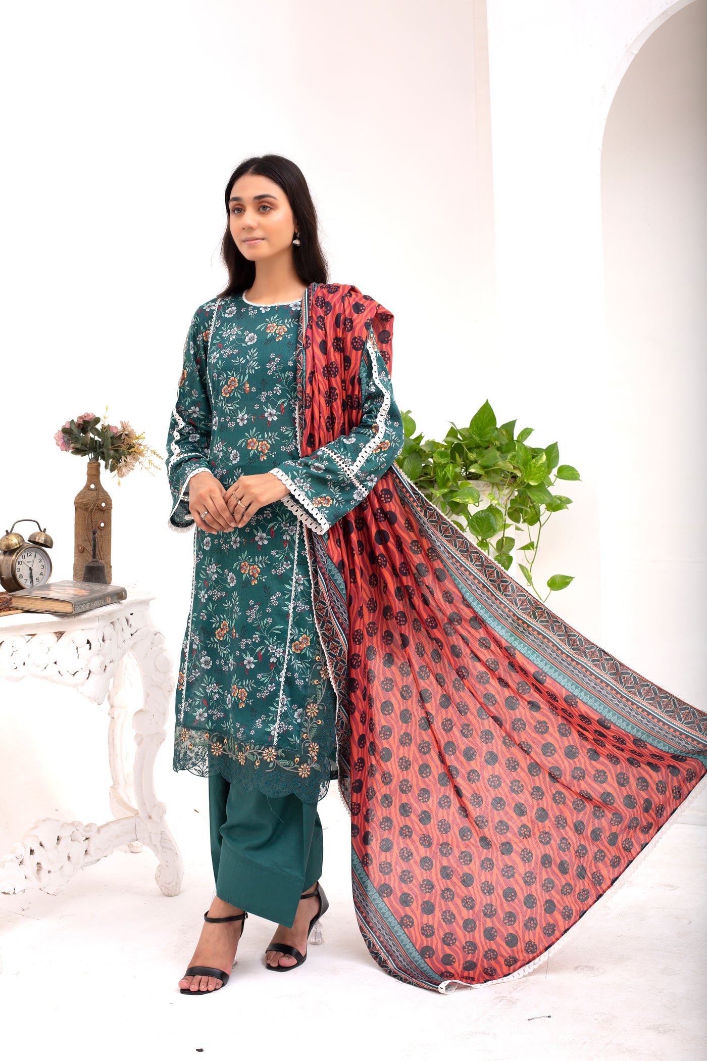 This elegant 3-piece women’s Kurta Set is designed for effortless comfort and timeless charm. The long kurta, crafted from soft green lawn fabric, features beautiful patchwork detailing for a touch of sophistication. It’s perfectly paired with a cotton farshi shalwar and a matching lawn dupatta, creating a breezy and graceful summer look.